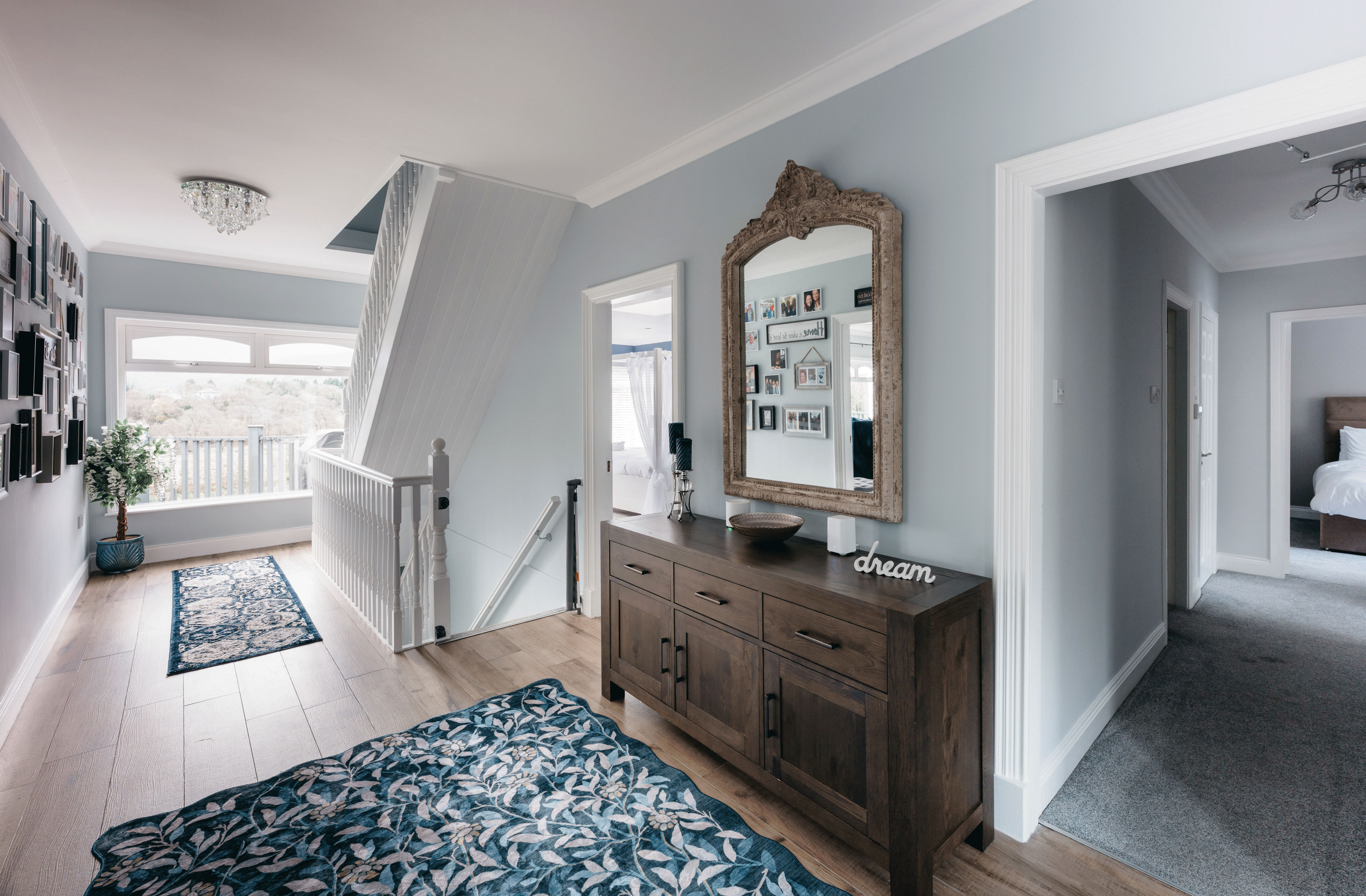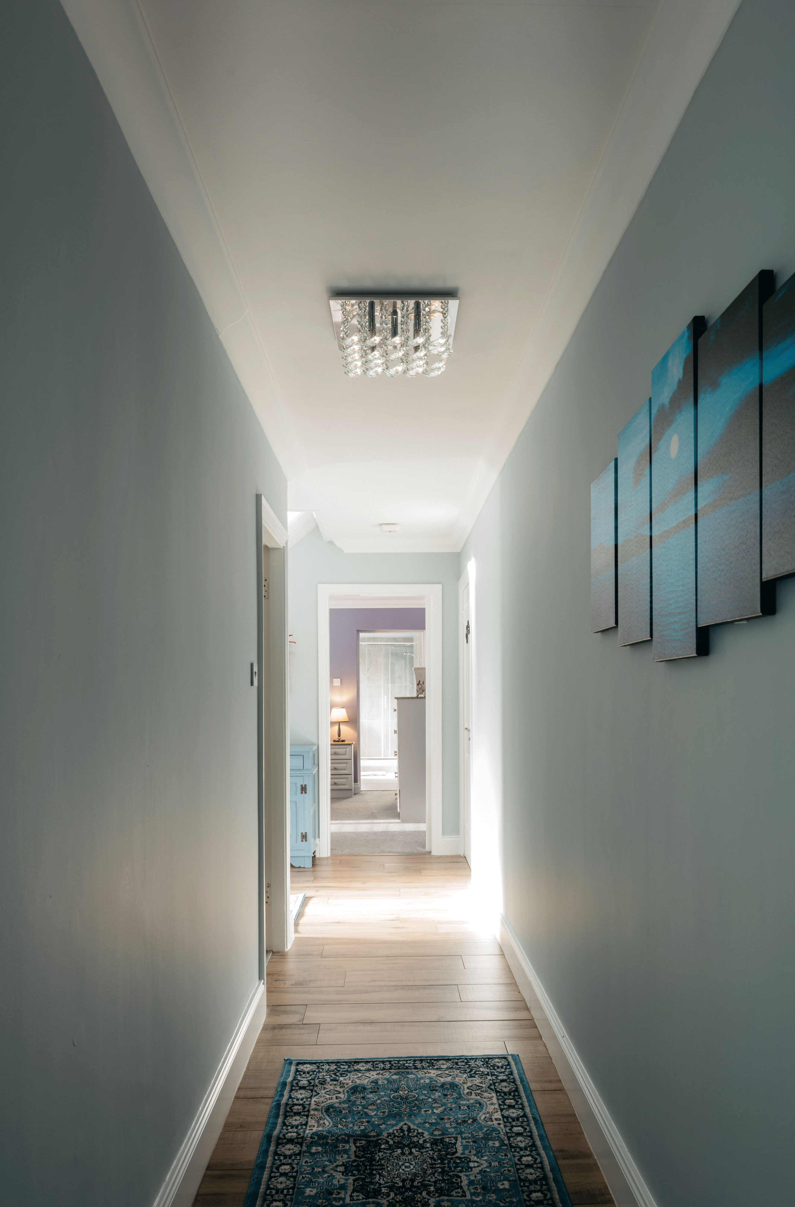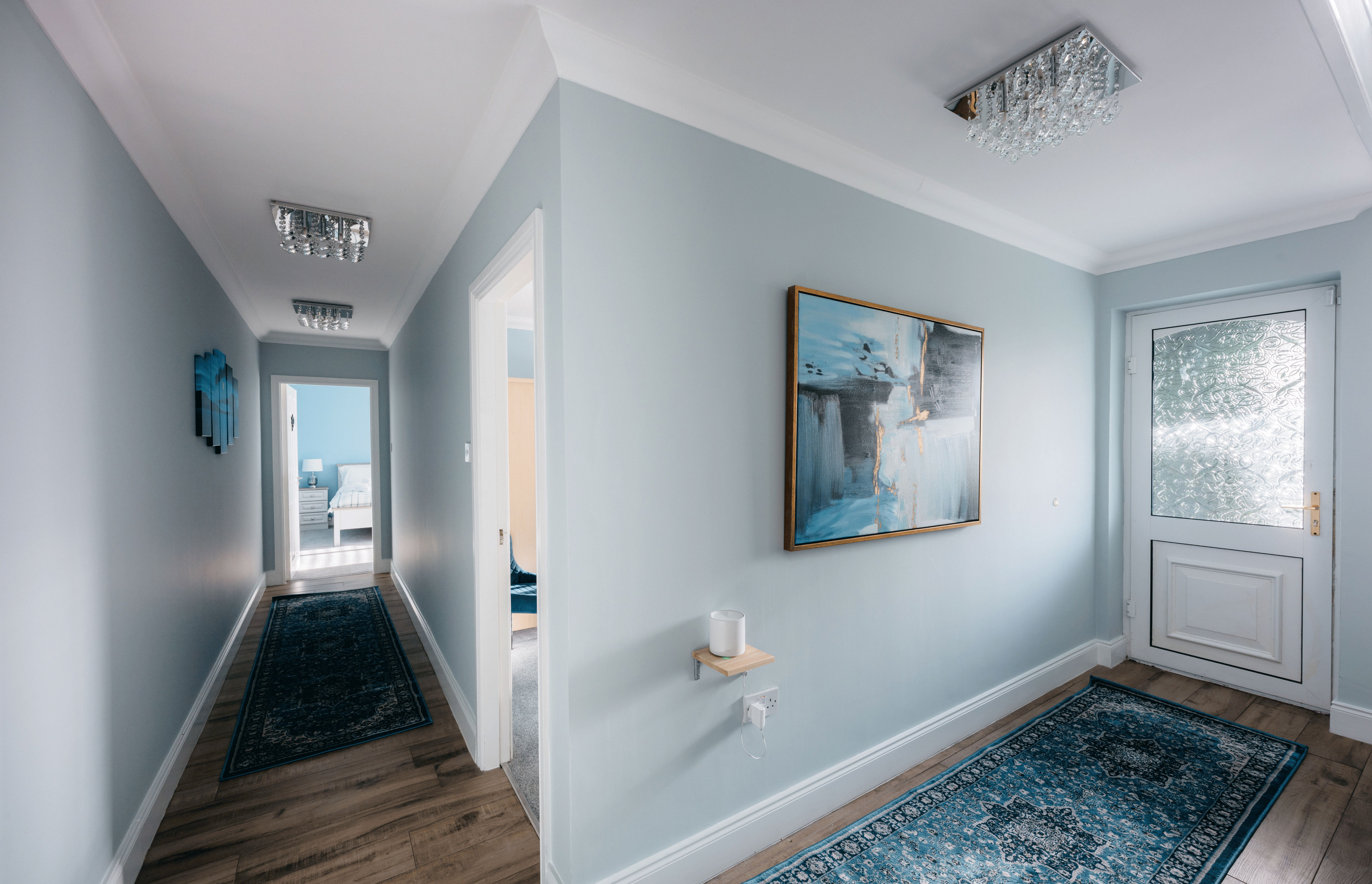 Guests arrive into a bright, gallery-style entrance where crystal light fixtures cast a soft glow over framed artwork and paneled walls. The hallway draws your eye straight to a picture window framing the valley beyond, hinting at the views waiting throughout the house. It feels less like a hotel lobby and more like being welcomed into a beautifully curated home.