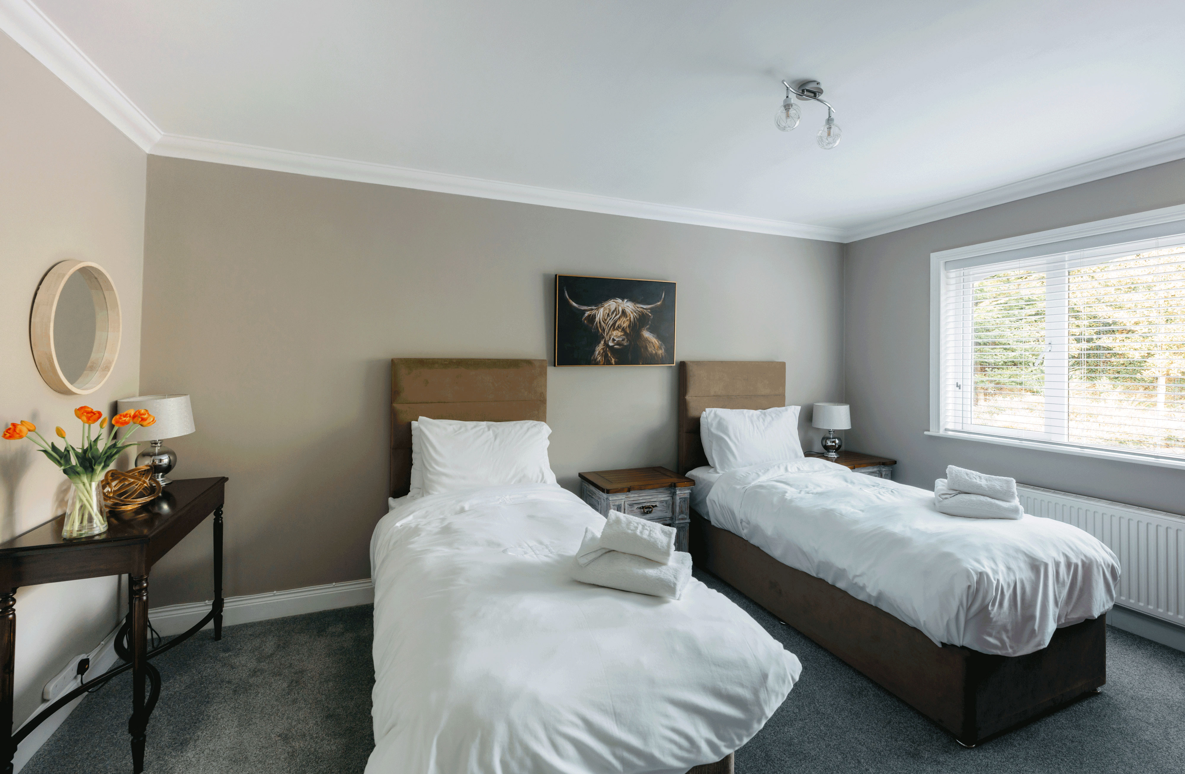 Oak is a warmly painted tan twin room with a subtle, restful charm and a secluded feel despite its main-floor location. Overlooking the front garden with the driveway beyond, it’s ideal for friends or family members who want to share a space without sharing a bed. Soft textures and thoughtful touches keep it feeling cozy and relaxed—more like a quiet guest wing than just a bedroom.