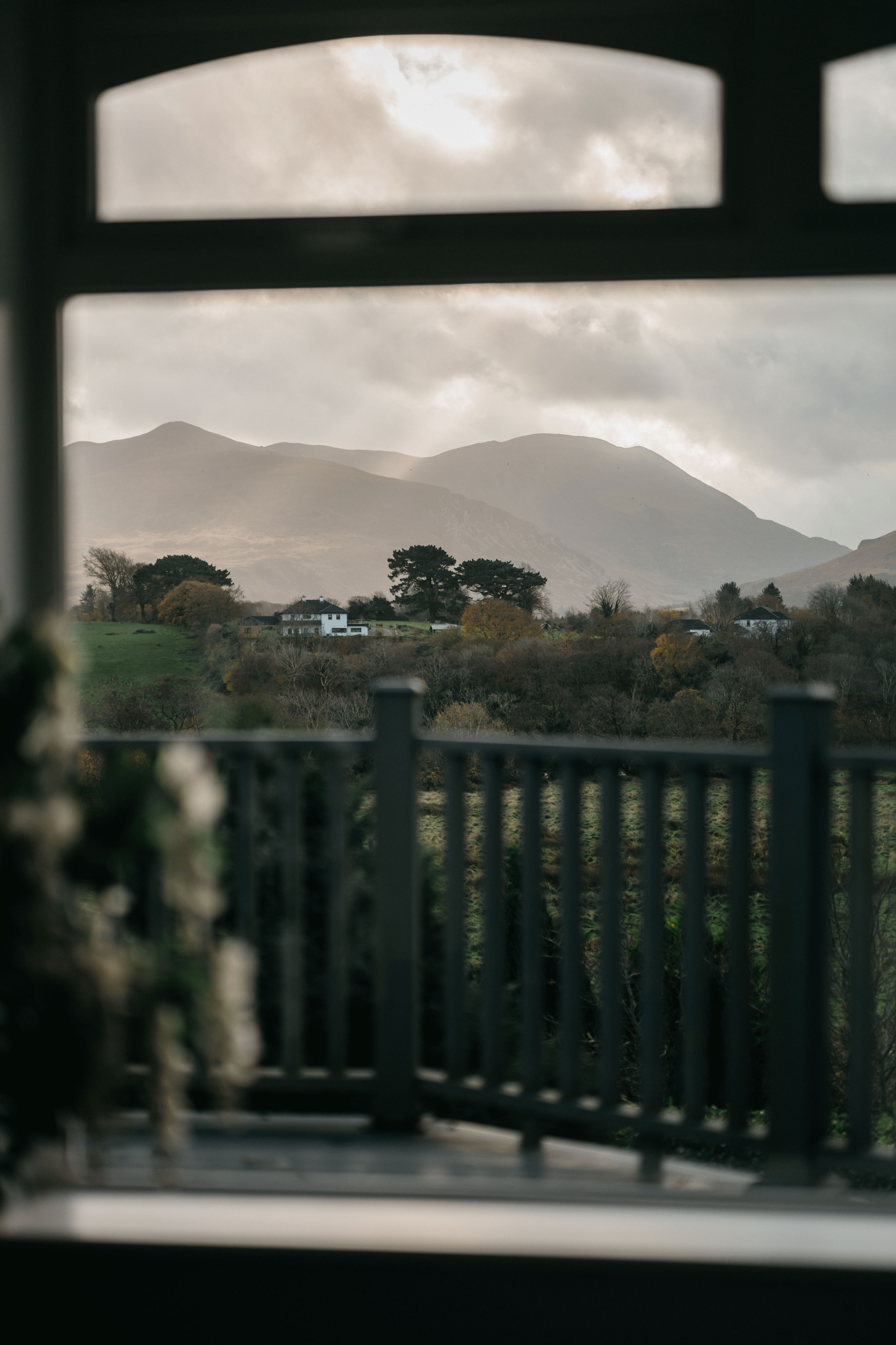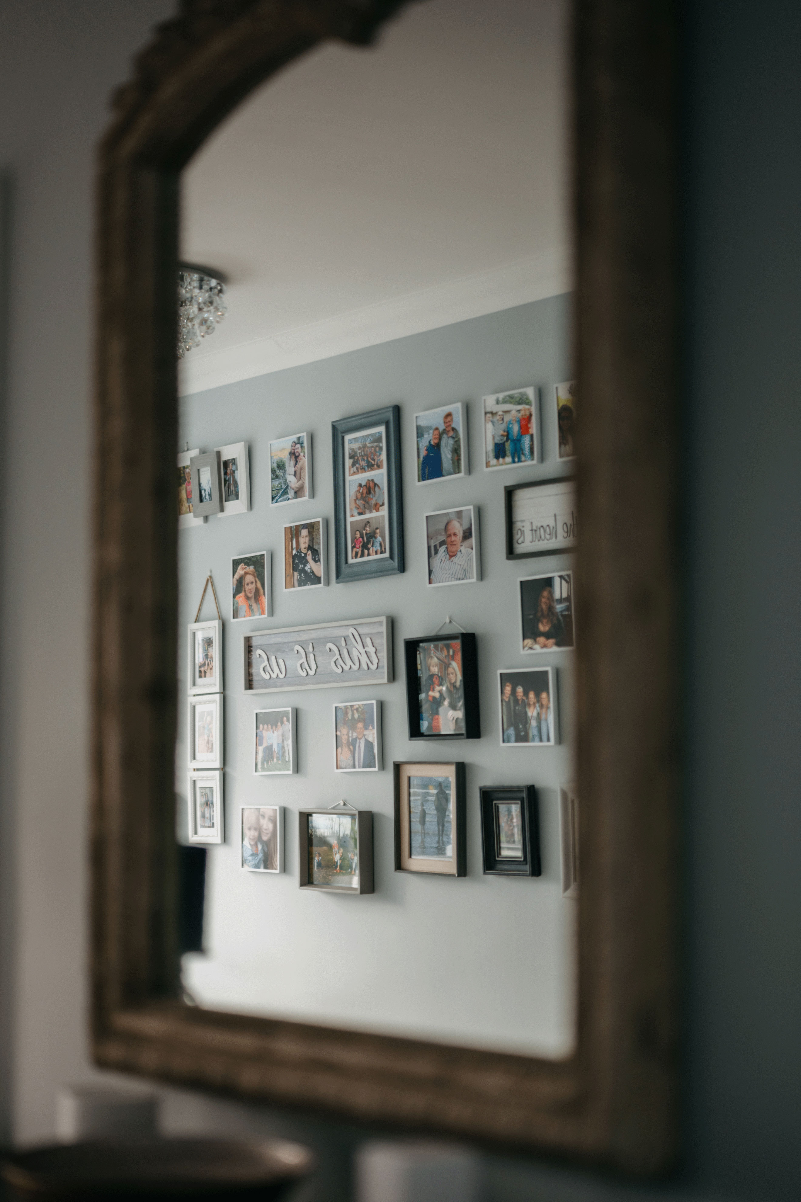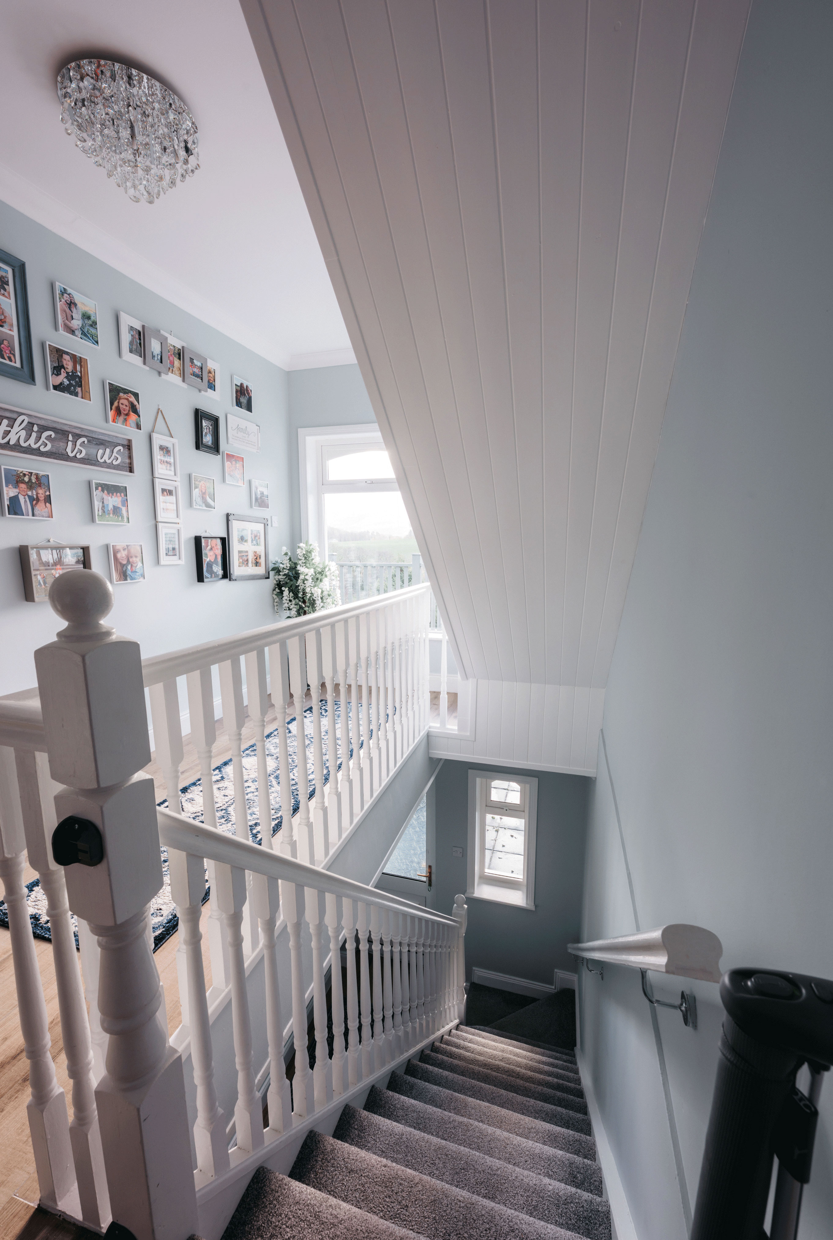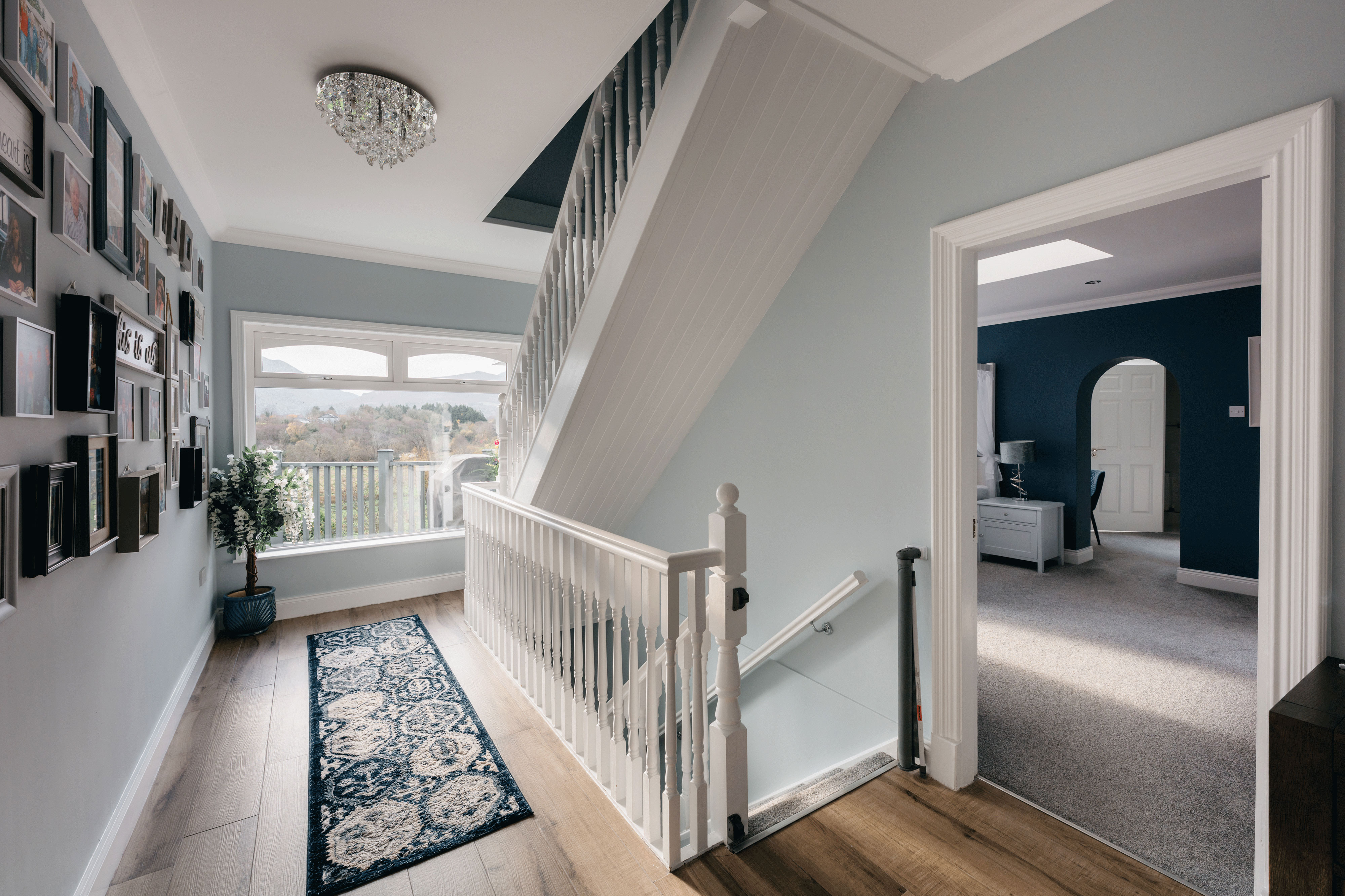 Guests arrive into a bright, gallery-style entrance where crystal light fixtures cast a soft glow over framed artwork and paneled walls. The hallway draws your eye straight to a picture window framing the valley beyond, hinting at the views waiting throughout the house. It feels less like a hotel lobby and more like being welcomed into a beautifully curated home.
