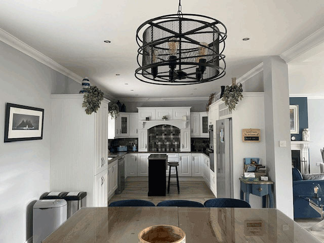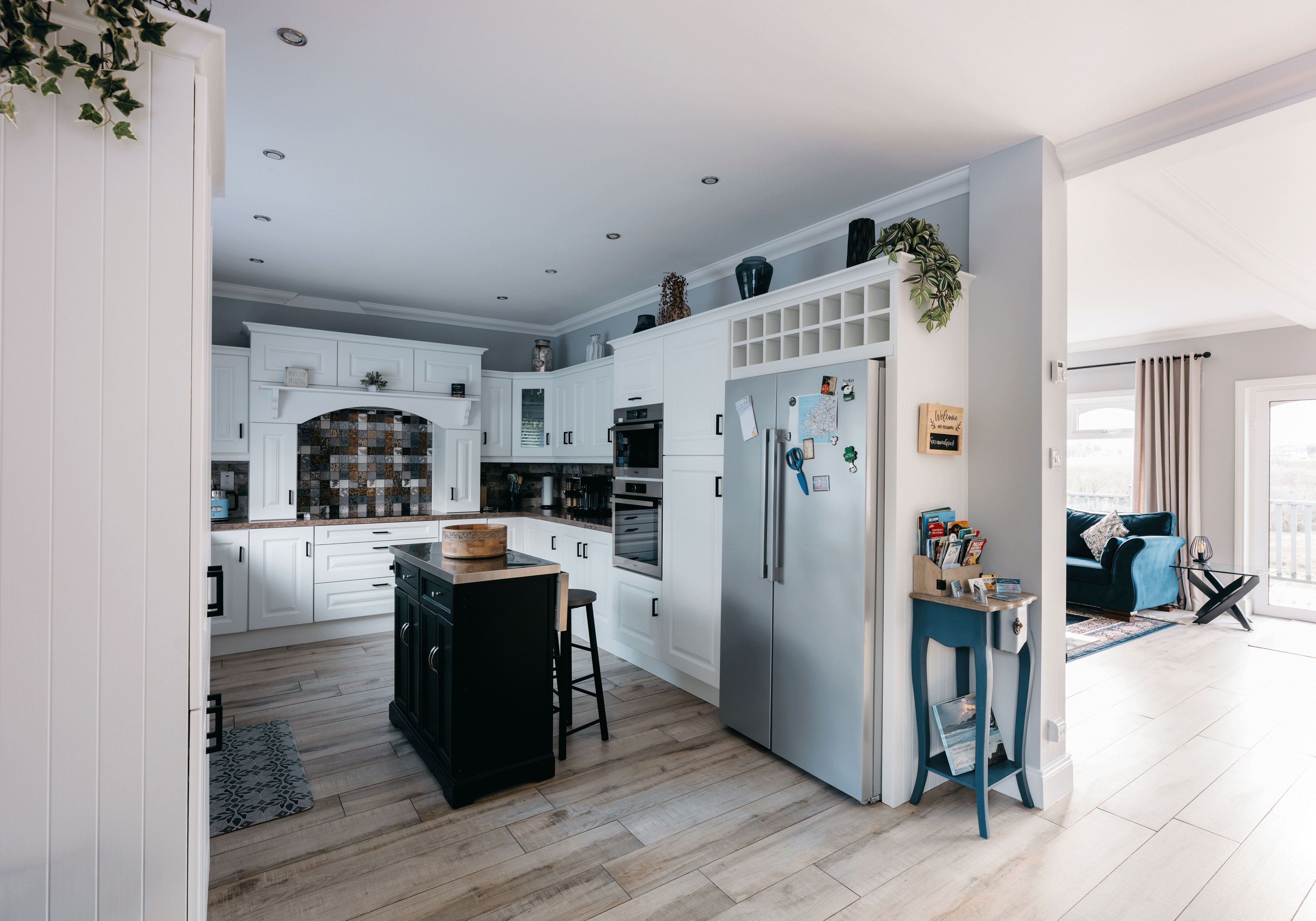 This bright, fully equipped chef’s kitchen is designed for lingering over coffee as much as it is for cooking a feast. White cabinetry, stone and mosaic tile backsplashes, unique vases and greenery above the cabinets create a fresh, elegant feel, while the large window looks out to the garden and drive. An induction range top, double ovens, deep ceramic sink and a movable island make it easy to cook for a crowd, with every utensil, pot, pan, and baking tin ready and waiting. All you need to bring is a recipe—and maybe an appetite.